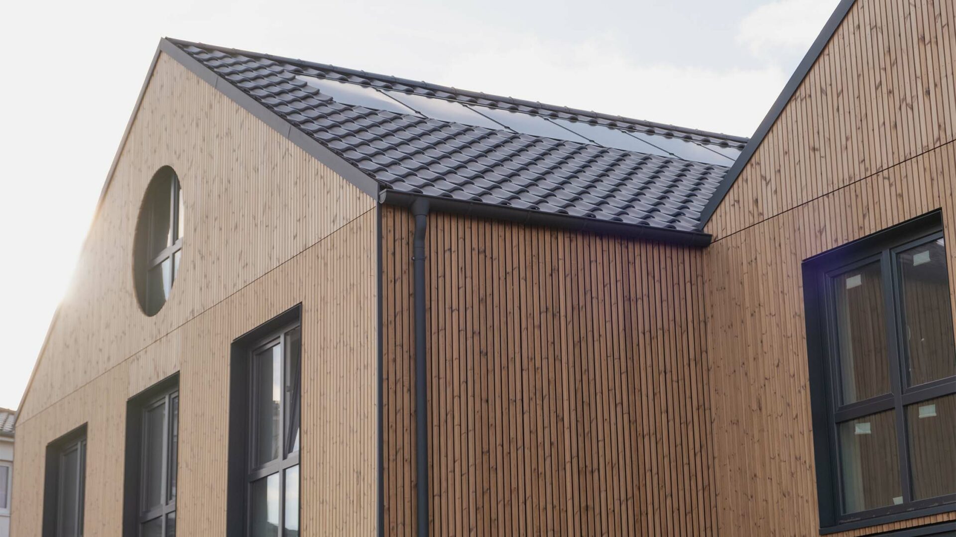 Unter dem traditionellen Satteldach, dass das zeitlose Design des Hauses betont, fügt sich eine neuere Blechfassade im Obergeschoss harmonisch ein. Diese Dachsanierung verleiht dem Haus nicht nur einen frischen, zeitgemäßen Look, sondern verbessert auch die Langlebigkeit und Wetterbeständigkeit des Gebäudes.